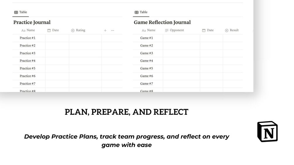Never wonder what drills you will run at practice again. Build your practice plan using the included Practice Journal template. After practice, reflect on what worked, what did not, and what you want to focus on during the next practice.
